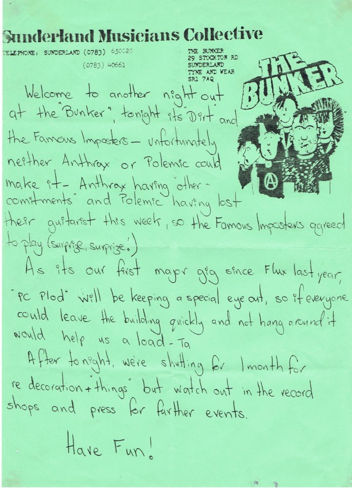 The police would try to come to gigs we always refused entry to them, explaining there was “nothing to see, just a load of pogoing punks and anyway it was a private members’ club and they weren’t members.” They were always OK about it. There was enough trouble in Sunderland for them to deal with without bothering us. There were two train of thought about this: either the police in Sunderland didn’t care about us, and just let us get on with it; or, the existence of the Bunker meant the police knew were all the political trouble makers in Sunderland could be found. When the police raided a flat in Park Place, where two of the punk activists involved in the Bunker were living, on the pretext of investigating a burglary, it was like something out of the Young Ones.