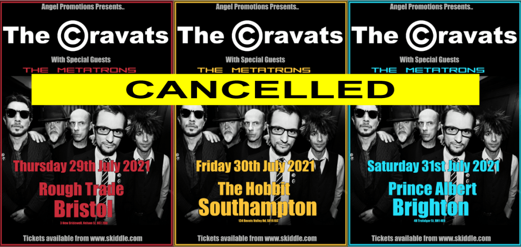Unfortunately, due to a serious ongoing medical issue concerning a band member’s immediate family, The Cravats have to cancel all live appearances for the foreseeable future.