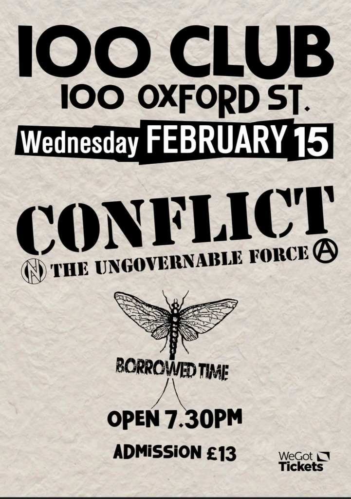 CONFLICT ARE JOINED by Borrowed Time for a rescheduled gig at 100 Club on London’s Oxford Street on Wednesday 15 Feburary 2023.