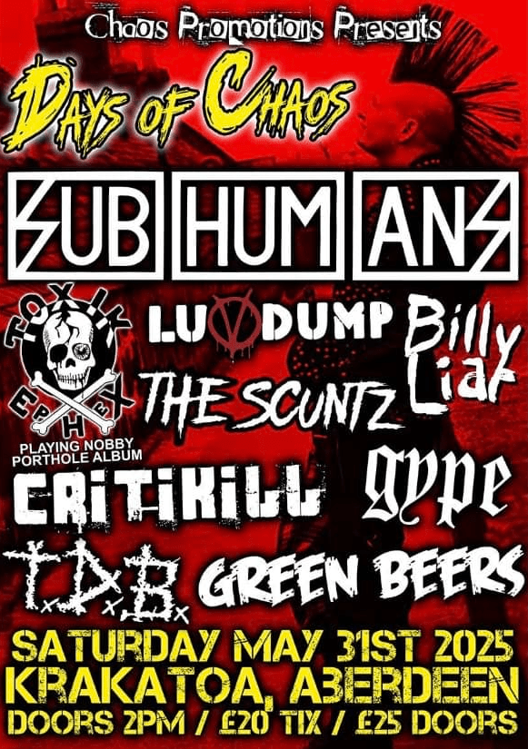SUBHUMANS, TOXIK EPHEX, LUVDUMP, BILLY LIAR, THE SCUNTZ, CRITIKILL, GYPE, T.D.B., GREEN BEERS