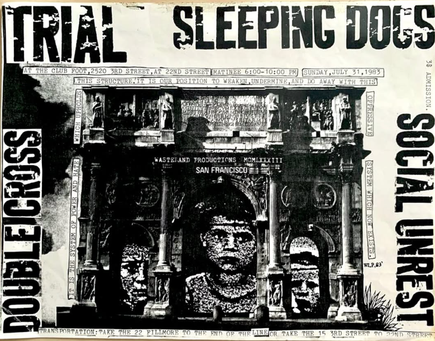 The exhibition includes dozens of photocopied and offset zines alongside numerous original paste-ups that King began making after he relocated to San Francisco in 1980. He produced these cheaply-made zines as a way to move through his graphic design concepts—stapling together a few letter-sized pages with minimal text and juxtaposed images that he drew from mainstream periodicals like National Geographic and the San Francisco Chronicle. This practice evolved into a robust yet obscure publishing output that varied widely in subject matter and approach, featuring dystopian science fiction zines indebted to J.G. Ballard (Suburbs of Hell), collaborative works made using mail art practices (Too Many Zombies; No. One), and projects that reflected the politics and anarcho punk aesthetics of his bands (Sleeping Dogs #1 and #2).